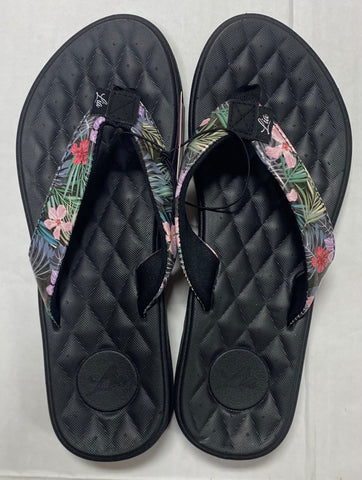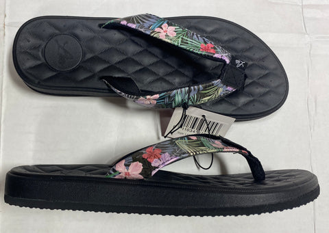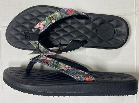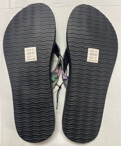 Lia Women’s with Tropical Strap Flip Flops Sandals. Available in 6, 7, 8, 9, 10, and 11. Color is black. Rubber sole and synthetic upper.