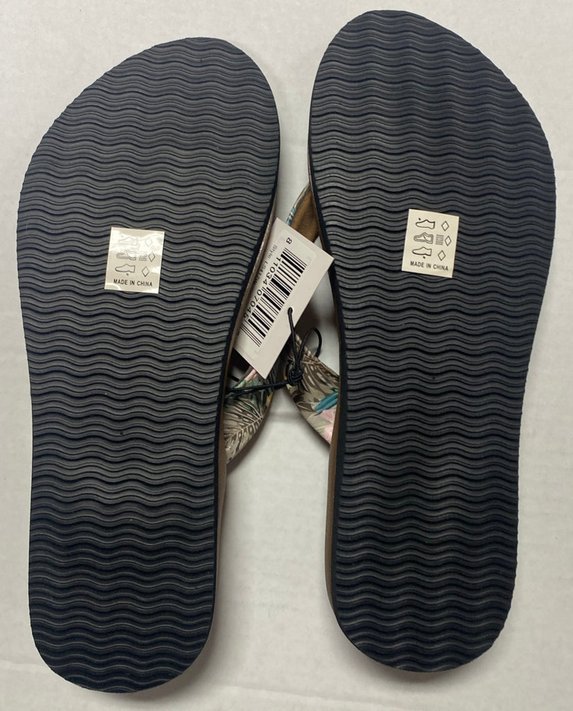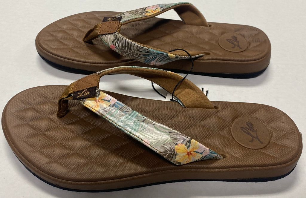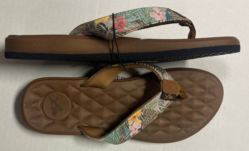 Lia Women’s with Tropical Strap Flip Flops Sandals. Available in 6, 7, 8, 9, 10, and 11. Color is brown. Rubber sole and synthetic upper.