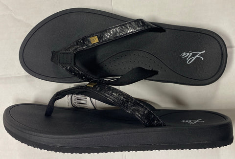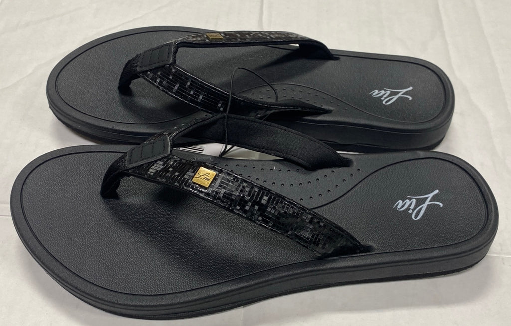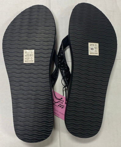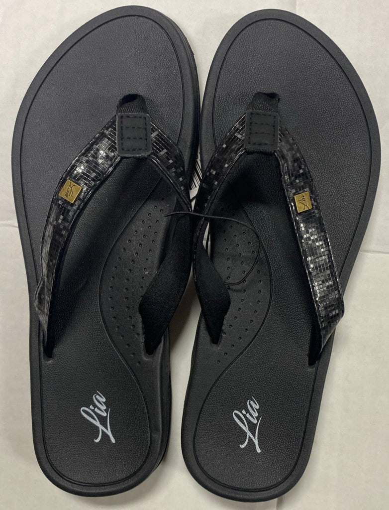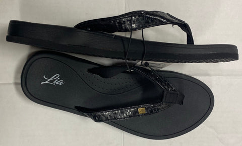 Lia Women’s Comfort Cushion Flip Flops Sandals. Available in 6, 7, 8, 9, 10, and 11. Color is black with black strap. Rubber sole and synthetic upper.
