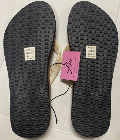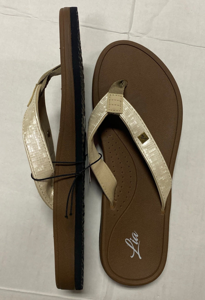Lia Women’s Comfort Cushion Flip Flops Sandals. Available in 6, 7, 8, 9, 10, and 11. Color is brown with cream strap. Rubber sole and synthetic upper.